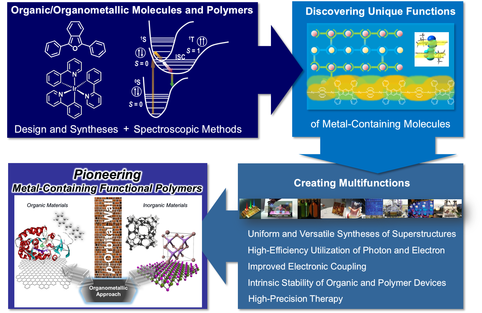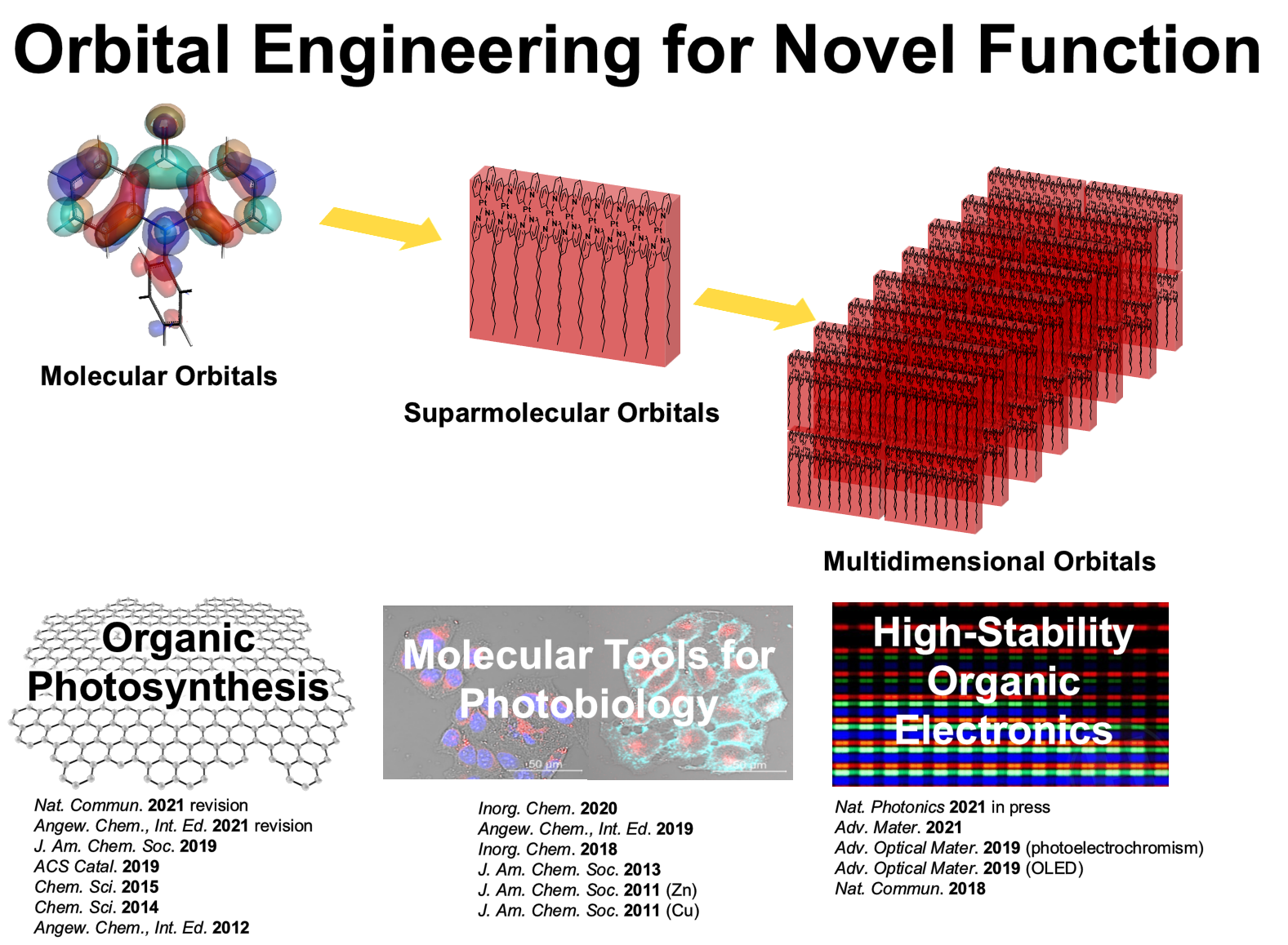 Our unique approach enables engineering molecular orbitals within a molecule and among molecules. In fact, understanding, control and utilization of supramolecular orbitals is very important because practical applications involve molecular and polymeric aggregates. This project targets to develop catalysts for organic photosynthesis, molecular tools for photobiology, and molecular designs to achieving high-stability electronic devices.